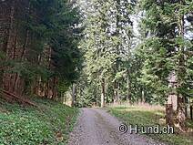 Nous retournons à la bifurcation, puis nous nous dirigeons vers "Wolfsgrueb". De ce côté également, il y a des possibilités de stationnement. Nous marchons maintenant un peu sur la route en direction du "Restaurant Scheidegg". Heureusement pour nous, la conduite est interdite ici aussi aujourd'hui. Avec une magnifique vue panoramique, il est possible de s'arrêter à des heures non Corona. Mais nous aimons les chemins que nous pouvons emprunter seuls et préférons de toute façon les promenades en forêt (à l'ombre). C'est pourquoi nous marchons après environ 20 minutes de la route à droite, pour retourner dans la forêt. Un grand et large chemin forestier nous mène vers "Hüttchopf" puis à "Tannen" où il descend en pente raide pour revenir au point de départ.
