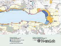 - Nell'area protetta, né i cani né i proprietari di cani sono autorizzati a lasciare i sentieri. Le zone corrispondenti sono contrassegnate in rosso sulla mappa a destra. Questo vale anche per i sentieri lungo il Glatt (questo è lo sbocco del Greifensee - vicino a Fällanden).