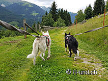 After a pleasant night on the camping site Garvera in Sumvitg we leave at 10.10 am with warm temperatures for today's stage. We walk downhill on a side road, cross under the tracks of the Rhaetian Railway and reach the village of Cumpadials a little later. From here it is only a short stretch down to the Vorderrhein. When we reach it, we turn right into a beautiful footpath. In steady up and down it winds through an old rockfall area with huge moss-covered boulders. Once through a dark fir forest, once close to the water, then again on a sunny slope with a view over the valley and the rapids of the Vorderrhein until we reach the power station. We cross the bridge and keep right at the next crossing. Here in the valley floor near Madernal we meet a wonderful hiking trail, which runs over the wide river upstream and is lined with alder and birch trees. We pass the hamlet of Disla with its beautiful old wooden houses. On a comfortable path along the banks of the river we continue to walk along the river until we reach the bridge Punt da Brulf. Over natural pavement and asphalt we walk up to the railway station of Disentis. Here we take a break, eat an ice cream and drink something cold. Meanwhile it is lunch time and the sun is slowly being covered by clouds. In addition, a light wind is blowing, which makes hiking very pleasant for us and the dogs. Disentis is the cultural and economic centre of the Bündner Oberland. The village owes its importance largely to the mighty Benedictine monastery of St. Martin, which was founded around the year 700. It was destroyed and rebuilt several times in the course of its history. Thanks to its grammar school and boarding school, the monastery is still an important educational institution in the region today.