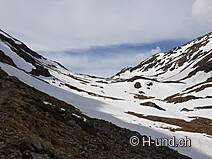 Now the sometimes quite steep ascent begins on the historic mule and pilgrims' path to the Scalettapass. There is still a lot of snow up here and the path is mostly not visible. At the beginning we manage to walk around a large snow field. Afterwards we are forced to put on our snowshoes. The coming ascent is extremely tiring, exhausting and nerve-racking. The snow fields are quite steep and the snow is very soft. We hardly find a hold with the snowshoes and slide down again and again. It takes an extremely long time to find the optimal path and to get ahead. We have to admit to ourselves that we will not reach our stage goal today. Moreover, the dogs are tired from the long walk and need a break. About one kilometre below the ridge we find at 6.20 pm a beautiful place with a great view of the surrounding mountains and down to the Alp Funtauna and pitch our tent here.