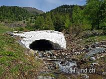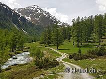 From Chapella we continue walking over lush pasture land and after about 20 minutes we reach the temporary settlement Susauna, the only village in the Val Susauna. Here, more than 20 people live during the summer, most of them speak the Rhaeto-Romanic dialect Puter and are mainly of Reformed denomination. After Susauna we hike on a forest path through the beautiful valley, always along the river Vallember. The valley fascinates us with its rugged beauty and remoteness. The landscape here is simply grandiose. For a walk with dog this place is highly recommended. The path leads steadily slightly upwards and is easy to master. Only the last 3 km up to the Alp Funtauna are a little steeper and accordingly more strenuous. The alp is situated at 2'192 m above sea level in the middle of green meadows, surrounded by splashing brooks. Incidentally, the place is teeming with marmots, which respond to our arrival with loud whistling sounds.