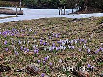 Nous continuons à travers la forêt enchantée, qui porte bien son nom. Les enfants ne sont pas les seuls à se laisser envoûter ici - le chemin enchanté, le jeu de lumière entre les arbres et les premiers messagers du printemps garantissent des moments magiques. Entre-temps, nous passons encore quelques champs de neige - notre Kaya se réjouit visiblement des derniers restes de neige de la saison. Et soudain, ils sont là ! Les premiers crocus sortent du sol. La saison des crocus a officiellement commencé.